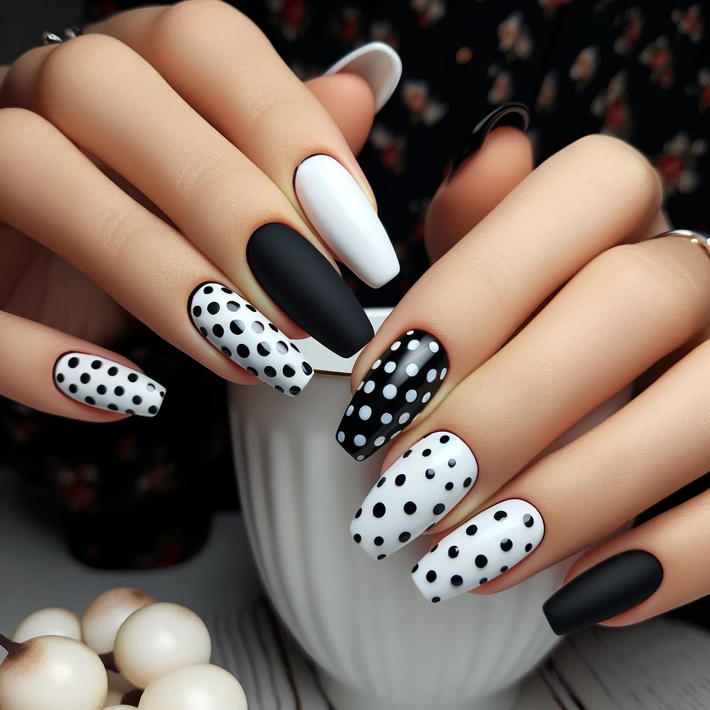 One of the easiest yet most charming designs is the monochrome polka dot. Start with a clean, white base coat and allow it to dry. Using a dotting tool or the end of a bobby pin, create black polka dots of varying sizes across your nails. This playful design is simple to achieve and adds a fun element to your look. Polka dots are perfect for any occasion, from casual outings to more formal events, and can be personalized with different dot sizes and placements.