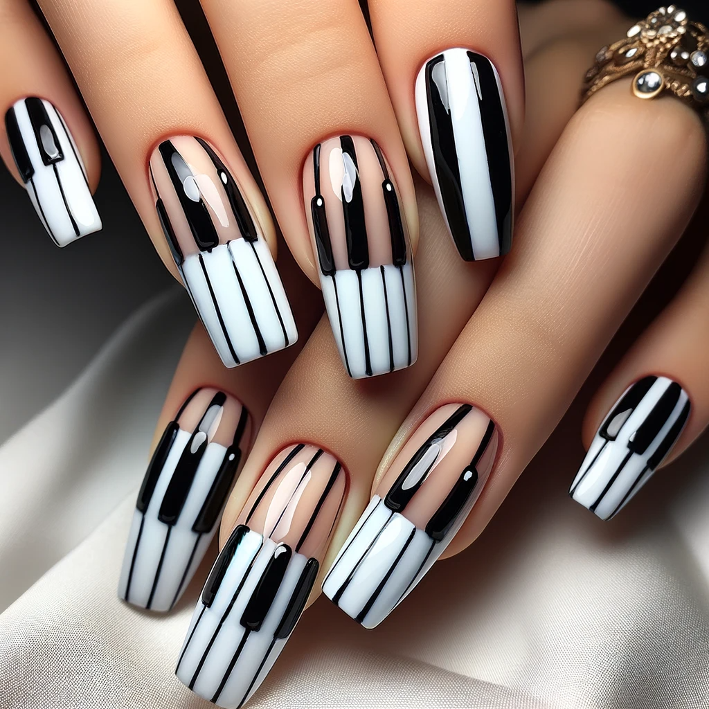 For a fun and musical twist, try the piano keys design. Start with a white base coat and allow it to dry. Using black polish and a thin brush, create a series of black rectangles on one side of each nail to represent piano keys. This design is perfect for music lovers and adds a playful touch to your nails. It’s unique and eye-catching while maintaining a classic feel, making it suitable for both casual and formal occasions.