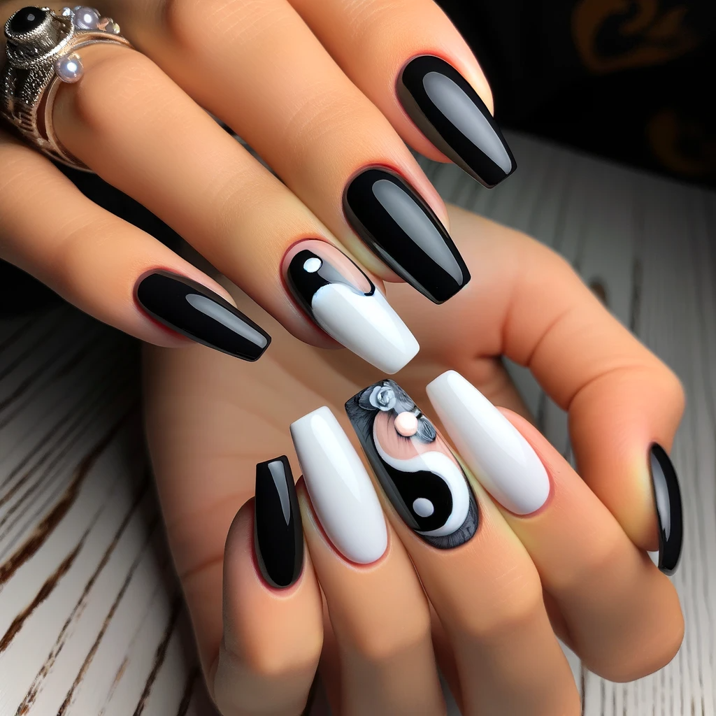 The yin and yang symbol represents balance and harmony, making it a meaningful design choice. For this look, paint your nails with a black base coat, leaving one or two nails bare or painted white. On the white nail, draw a small black circle with a white dot in the center to represent the yin and yang symbol. You can also incorporate the design on the other nails for a cohesive look. This design is elegant and thoughtful, perfect for those who appreciate symbolism in their nail art.