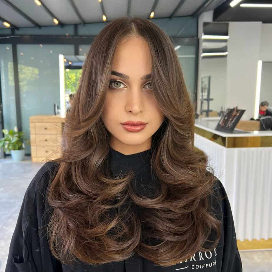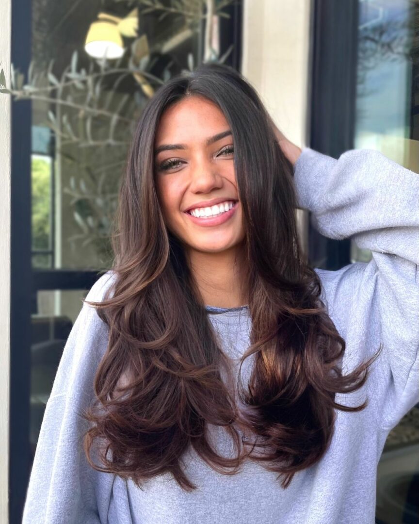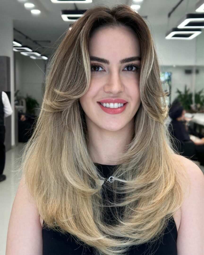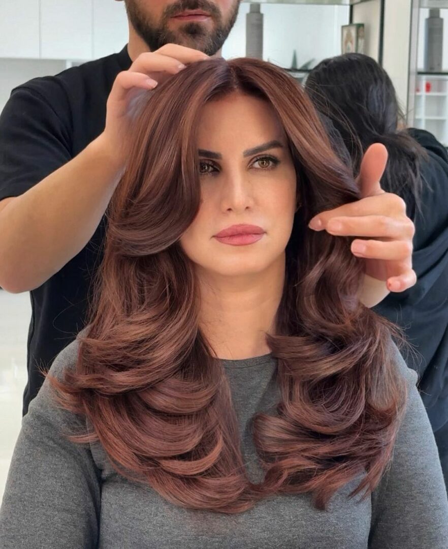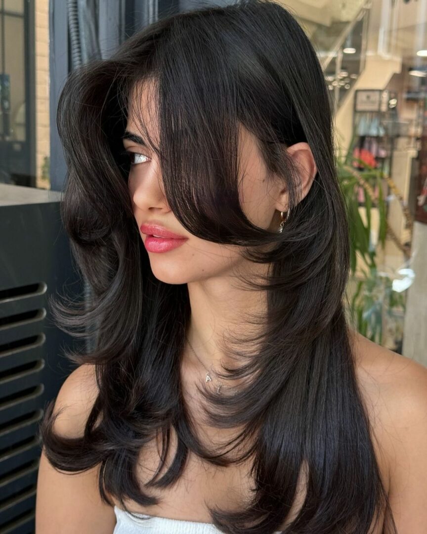 Bombshell layers combined with a curtain fringe give you a voluminous and glamorous hairstyle that’s perfect for special occasions. The layers add body and fullness, while the curtain bangs frame your face, creating a balanced, show-stopping look.