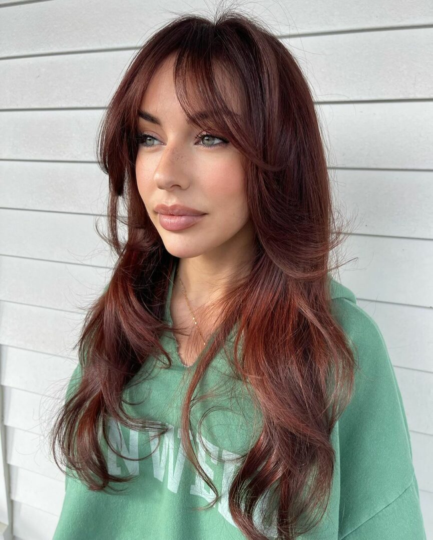 Add a fiery touch to your long hair with ginger tones and curtain bangs. The vibrant hue adds warmth and personality to your style, while the bangs give a soft, face-framing effect. This is a great look if you’re ready for a bold color change.