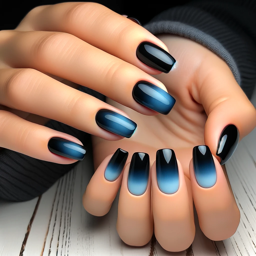 Embrace the beauty of the winter night sky with a black to deep blue ombre design. Start by applying a black base coat. Once dry, use a makeup sponge to blend deep blue polish upwards towards the cuticle, creating a stunning gradient effect. This bold design exudes sophistication and mystery, making it perfect for setting a dramatic tone for the year ahead.