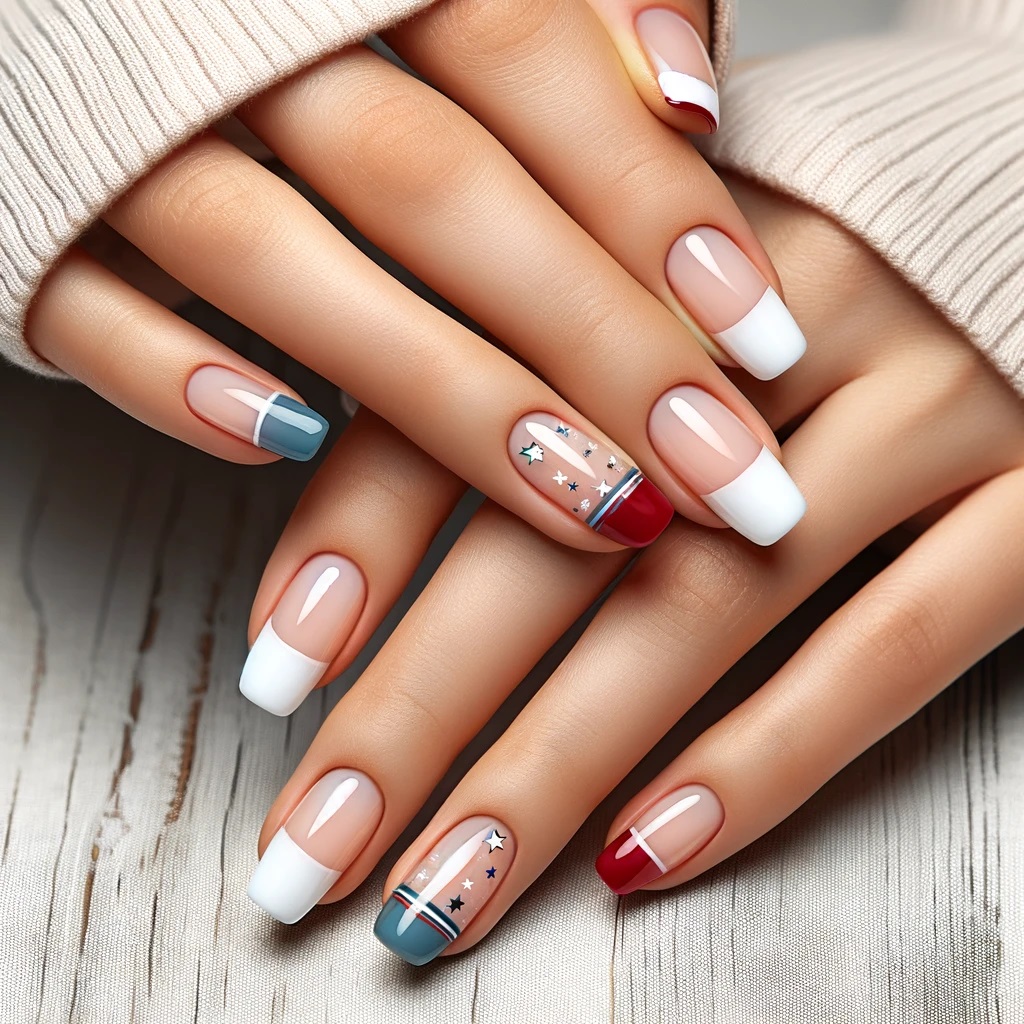 Give the classic French tip a patriotic twist with a flag-inspired design. Use a bold red base for the tips and a white nail bed, then add small blue accents or stars on an accent nail. This elegant yet spirited look is perfect for any Memorial Day gathering.