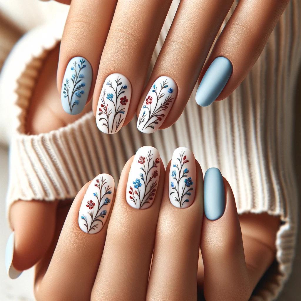 Celebrate the spirit of freedom with a floral design that incorporates red, white, and blue flowers. Use a light base color and paint delicate flowers on each nail. This design captures the beauty of summer while honoring the holiday’s significance.