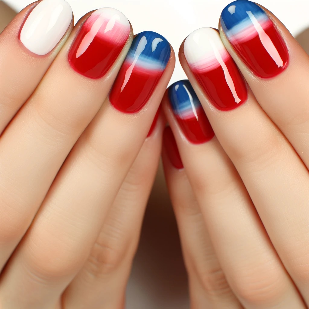 Create a stunning ombre effect using red, white, and blue shades. Start with a red base and blend into white and blue at the tips. This stylish design represents the colors of the American flag and is perfect for those looking for a trendy take on patriotic nails.