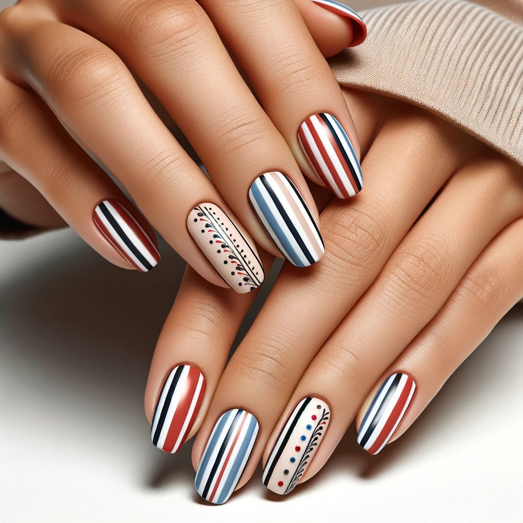 Create a sophisticated look with elegant stripes in red, white, and blue. Paint your nails with a neutral color and add vertical or horizontal stripes in patriotic colors. This design is perfect for those who want to celebrate the holiday with a touch of class.