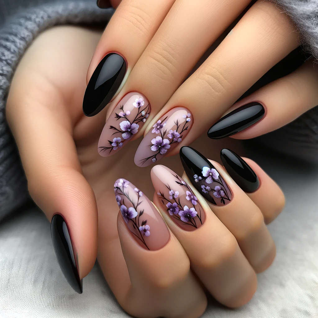 Floral designs can bring a touch of femininity and elegance to your nails. Begin with a solid purple base coat and allow it to dry. Once dry, use a thin nail art brush or dotting tool to paint delicate black flowers. You can choose to create small blossoms, vines, or more intricate designs depending on your skill level. This combination of purple and black adds a sophisticated twist to traditional floral nail art, making it perfect for spring or any occasion where you want to showcase your softer side.