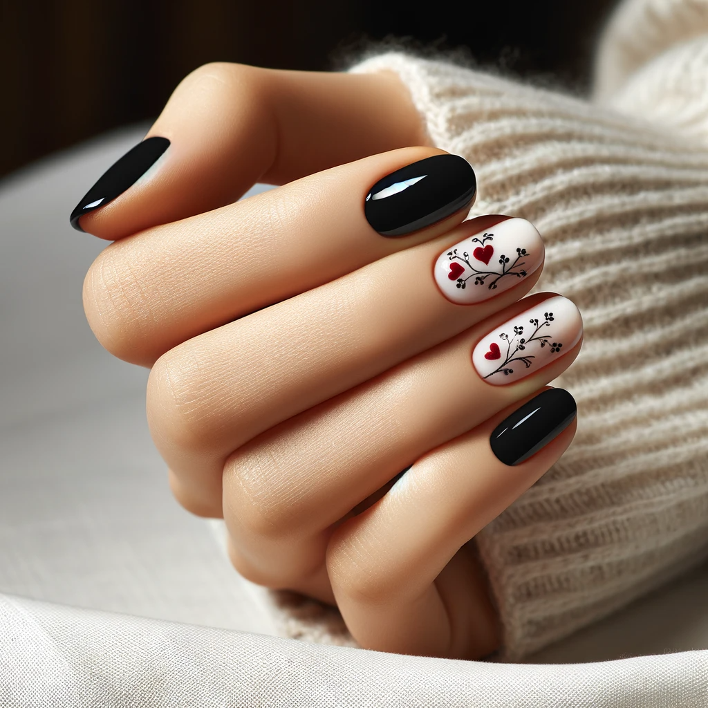 An elegant red and black design can be achieved with a combination of matte and glossy finishes. Start by painting your nails in alternating red and black shades. On the black nails, use a glossy top coat to create small, shiny heart shapes, while on the red nails, keep the hearts matte. The interplay between different textures adds sophistication and depth to the design, making it a perfect choice for formal events or special occasions where you want to add a touch of elegance to your look.