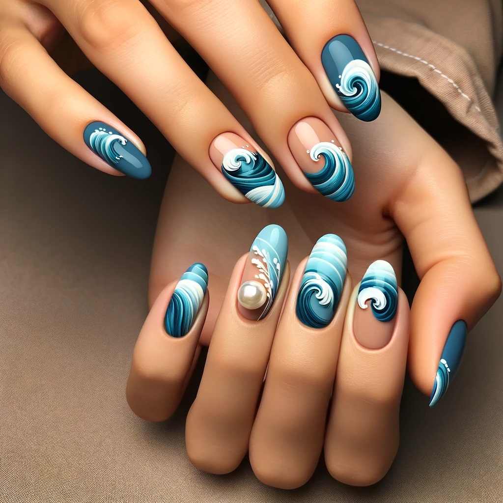 Capture the beauty of the sea with an ocean waves design. Use varying shades of blue and turquoise as your base, and add white tips or wavy lines to mimic the movement of water. Finish off the look with tiny starfish or seashells painted on accent nails. This design is ideal for beach lovers and anyone looking to bring a little seaside charm to their nails.