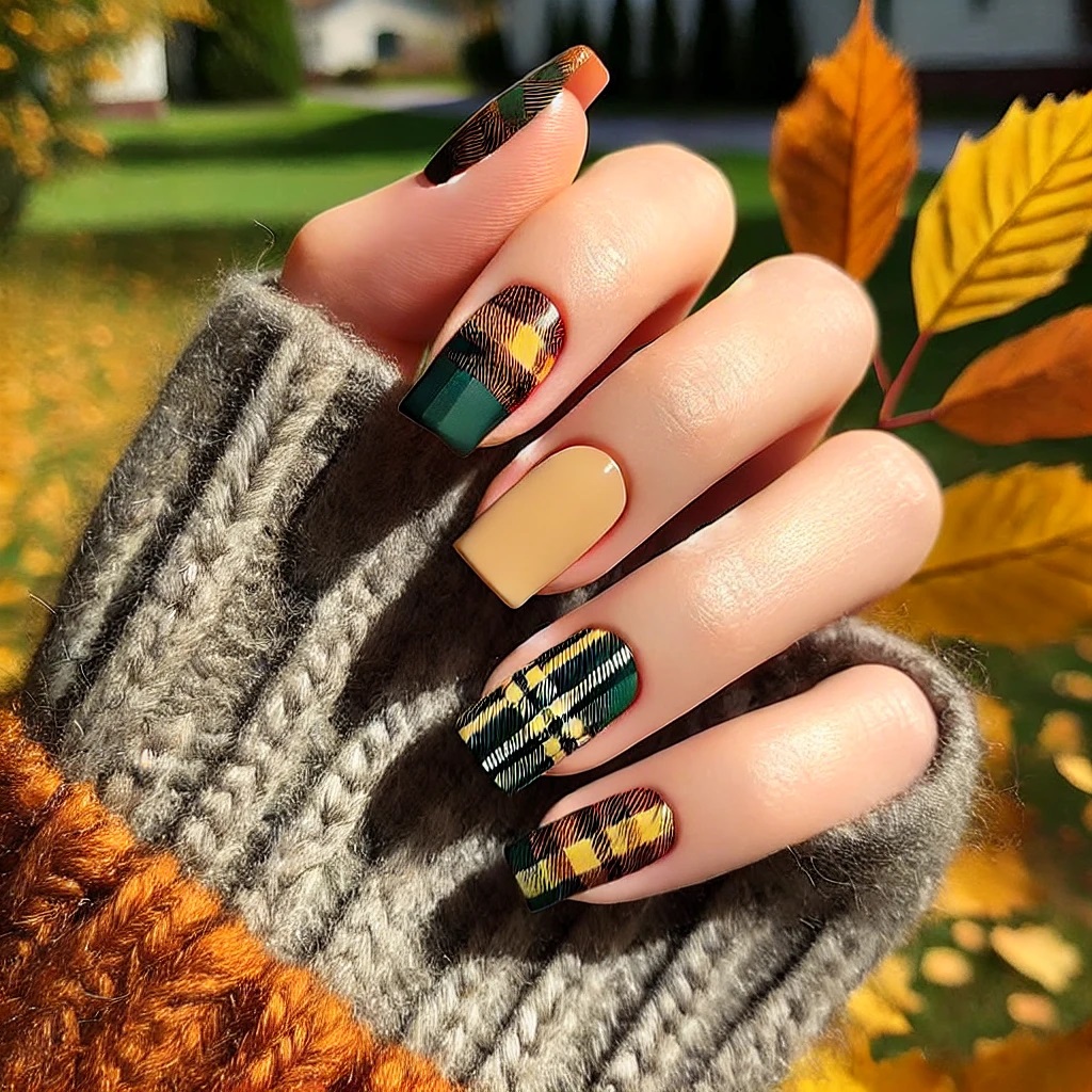 Plaid is a fall wardrobe staple, and it works perfectly on nails too. Choose classic autumn shades like mustard yellow, deep red, or forest green for the plaid lines, and pair them with a nude or cream-colored base. The plaid pattern adds a rustic yet stylish vibe that screams fall fashion.